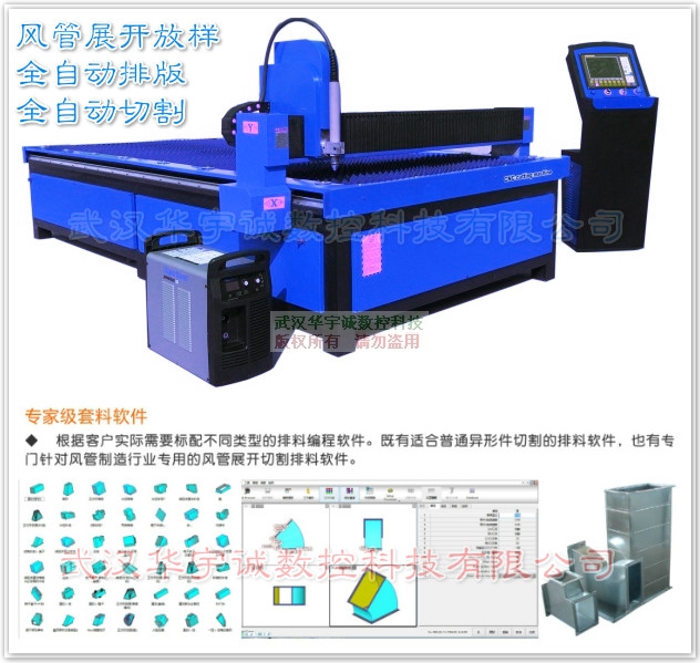 所謂的風(fēng)管我們可以按按截面形狀,風(fēng)管可分為圓形風(fēng)管,矩形風(fēng)管,扁圓風(fēng)管等多種,其中圓形風(fēng)管阻力小的高度尺寸大,制作復(fù)雜。所以應(yīng)用以矩形風(fēng)管為主。按材質(zhì),風(fēng)管可分為金屬風(fēng)管,復(fù)合風(fēng)管,索斯風(fēng)管等。當(dāng)今市場上等離子風(fēng)管切割下料設(shè)備繁多,那么今天華宇誠數(shù)控科技有限公司就本公司生產(chǎn)的風(fēng)管下料切割機(jī)其中的一種設(shè)備數(shù)控等離子風(fēng)管切割機(jī)做個(gè)簡單介紹:全自動風(fēng)管等離子切割機(jī)主要是完成部件的自動化放樣和切割,只需要要在2維或3維圖形中輸入想要的尺寸,軟件就可以自動套料,然后等離子切割機(jī)可以自動將圖形切割機(jī)出來。法蘭、咬口、大板拼接的預(yù)留量電腦都能自動計(jì)算。